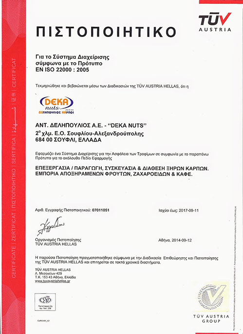 Στην παραγωγική διαδικασία εφαρμόζεται το Σύστημα Διαχείρισης και Ασφάλειας Τροφίμων ΕΝ ISO 22000:2005, με στόχο την παραγωγή ασφαλών τροφίμων, καθώς και την διασφάλιση της υγείας των καταναλωτών.